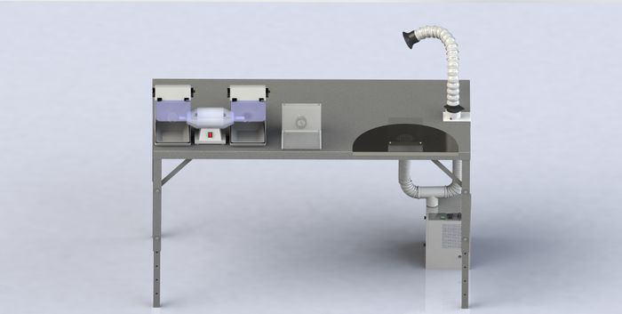 The Vaniman Downdraft Assembly (Model 20125) is a benchtop dust collection accessory designed to create a semi-enclosed dust collection area when using handpieces. It features a protective shield, padded wrist rests, vent selection, and a padded catch tray. Made from durable plexiglass and steel, this assembly provides efficient dust extraction, enhancing workspace cleanliness and safety.