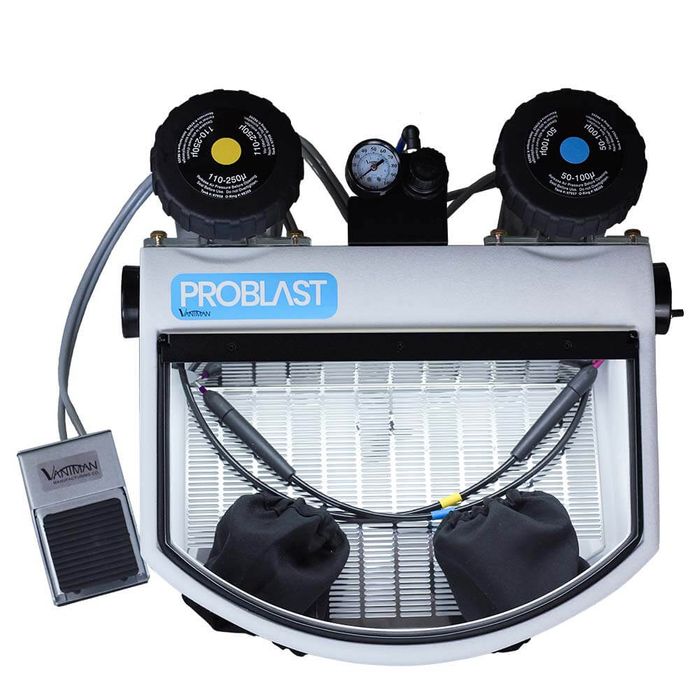 A high quality and economical blasting system for moderate to heavy production usage. Low maintenance media flow system virtually eliminates wasteful down-time and lowers maintenance costs. Microabrasive sandblasting system with two 50-100 micron tanks for variable applications.The Vaniman Master Problast 2 features our instant-off feature to allow for immediate stoppage of media flow once the foot pedal is released. This allows for more precise blasting and cuts down on media cost over time. An ideal blaster for multiple applications, the Master Problast 2 offers precision blasting with a smaller footprint.