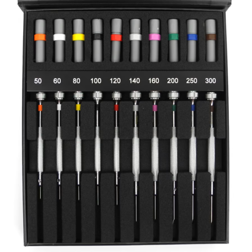 Used in watchmaking, electronics, modeling and many other applications. The New 10 piece set has a beautiful black case and of course is great Swiss made quality. 10 Flat head screwdrivers with sizes 0.5mm, 0.6mm, 0.8mm, 1.0mm, 1.2mm, 1.4mm, 1.6mm, 2.0mm, 2.5mm and 3.0mm. This set has replaceable blades and comes with spare blades for every screwdriver.