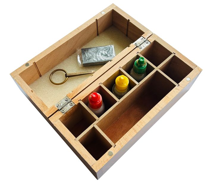 Precious metals acid tester kit for 9ct, 14ct, 18ct gold with testing stone and testing needles in a wooden box. Scratch your know gold and the test piece on the stone, place a drop of acid on each and if the reaction is the same the metal is the same.