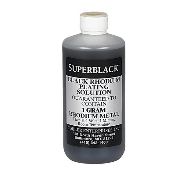 For professional use only. Cohler's new Superblack rhodium plating solution is a black rhodium plating solution that produces a darker oxidized grey-black plate on gold and other precious metals than ever before. Use it for a durable tarnish resistant dark finish for all your plating needs. Superblack has a deeper dark finish than the original Cohler black rhodium bath. It works better for matching dark stones or where you just want a darker black plating on your jewelry. Great for two-tone plating and touch up repairs. Plates at room temperature using a platinized titanium anode. PHONE TO ORDER