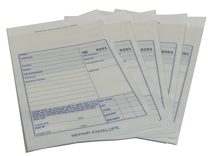 Numbered job packets with details of customer and job to be done etc. Measures 108x190mm Stick down flap safely seals envelope with customers repair inside. Price breaks = $375.00 for 500 ($0.75/each) - $700.00 for 1000 ($0.70each). Personalised with your logo available on request, minimum order of 1000, takes approximately 2 weeks and is $800.00+GST.