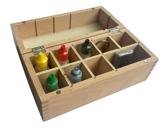 Test kit - 9ct, 14ct, 18ct, 22ct gold, Platinum with testing stone and testing needles for lower carat golds (9ct, 14ct & 18ct) and silver in a wooden box. Scratch your know gold and the test piece on the stone, place a drop of acid on each and if the reaction is the same the metal is the same.