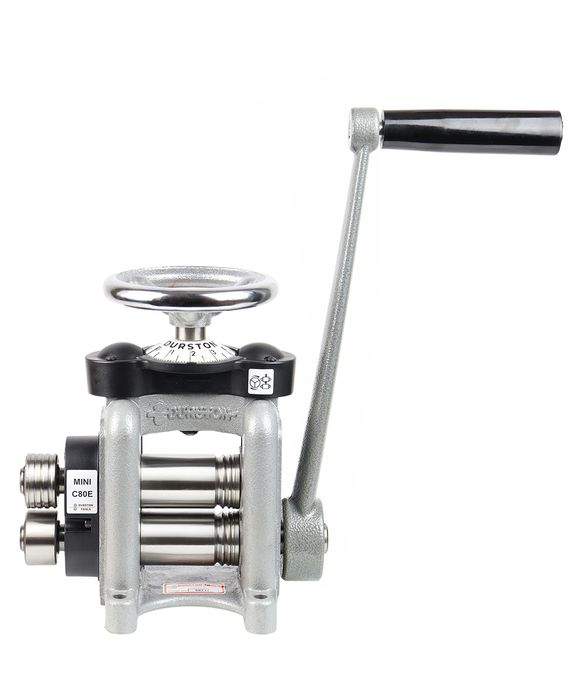 It is compact but still with everything you need and has precision hardened and ground rolls to 64RC. It has maintenance-free bearings and has large, easy-to-read calibrated discs. The side extension rollers come with four half rounds. The C80E has four wire shaping rollers ranging from 6.5mm to 1mm. The width of the rollers is 80mm with a diameter of 45mm and can take metal sheets up to 5mm thick. The mill also benefits from four side extension half rounds of 4, 3, 2 & 1.5 mm. The entry-level C80E rolling mill from Durston: part of the award-winning Durston product range since 1961. We recommend that your Durston rolling mill be securely fastened down for safety, and we have a variety of stands which are ideally suited for this purpose.ā C80ā Combination Rolling Mill