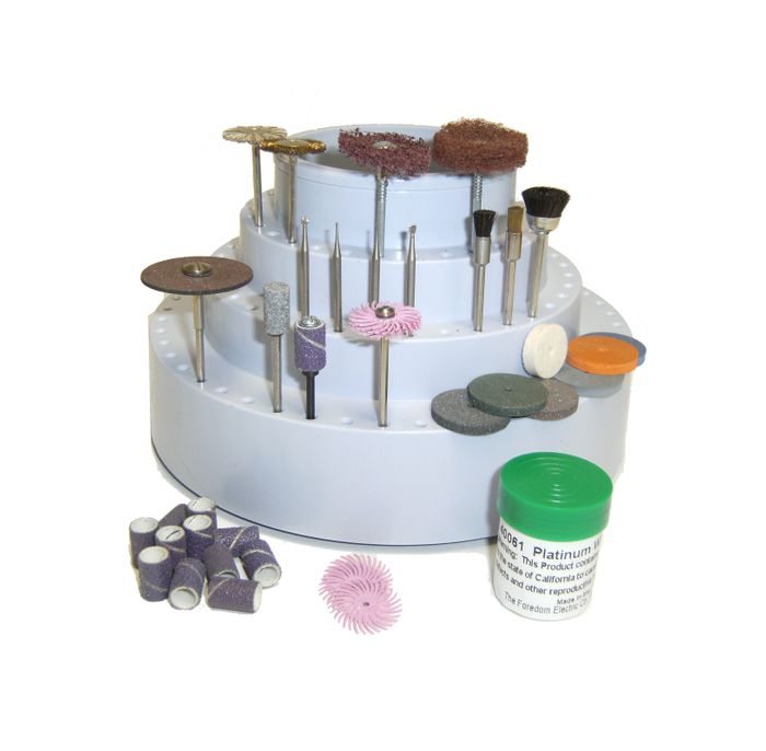 42-pc jewellery assortment with radial bristle discs, satin finishers, brushes, sanding bands, cut off disc and more. Also includes Rotating Bur Holder.