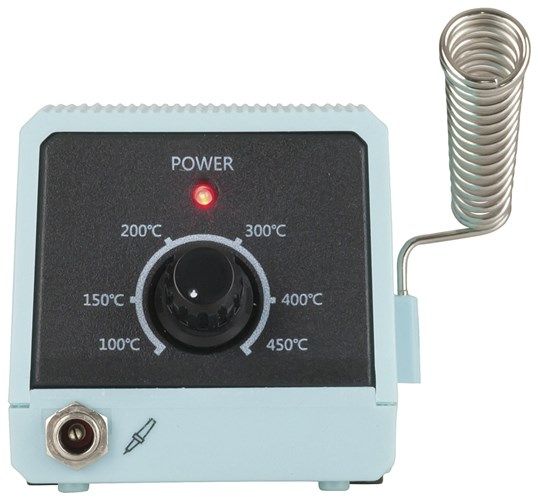 100-450°C temperature range. Temperature is selected with the rotary dial, and the base unit includes an integrated stand.